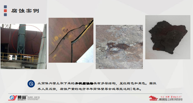 水泥回轉窯一般在1300℃以上的溫度中運行,在內襯耐火磚進行耐磨、隔熱防護后窯筒外壁長期處在300-400℃高溫,窯體除了耐火磚因窯體轉動而產生的摩擦外,還會受到高溫氧化、高溫腐蝕、冷凝腐蝕及酸堿腐蝕情況,尤其是近些年對環保的重視,要求部分水泥廠協同處理焚燒生活垃圾產生含氟離子介質;又因燃煤的品質情況,導致在焚燒的過程中,產生大量的含有氮氧化物、硫化物等氣象腐蝕介質,以上腐蝕介質都加快了回轉窯筒體的腐蝕,也會對回轉窯的安全生產造成影響。