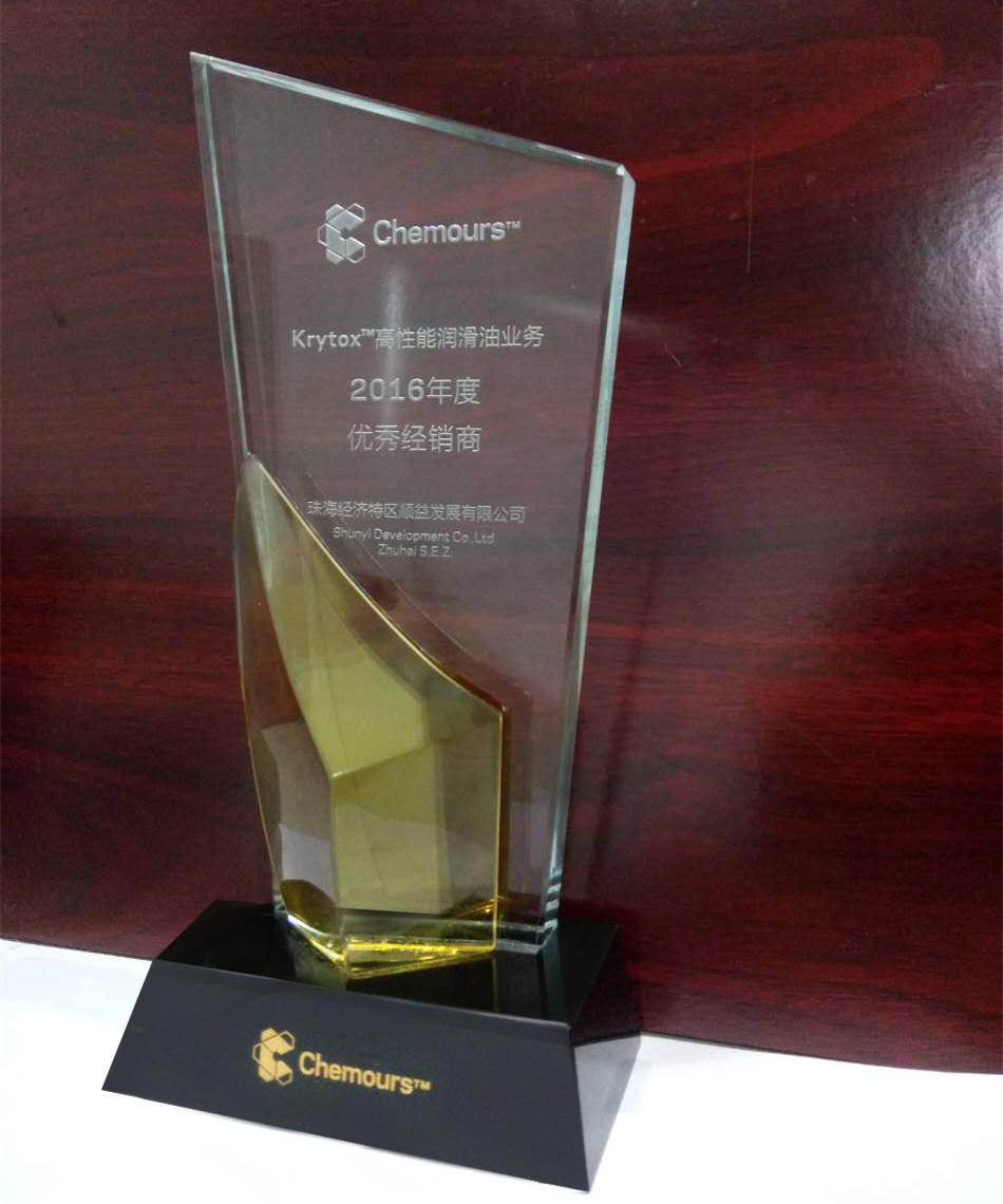 2016年順益體系(集團(tuán))在Krytox?高性能潤(rùn)滑油業(yè)務(wù)領(lǐng)域業(yè)績(jī)突出,榮獲2016年度優(yōu)秀經(jīng)銷商獎(jiǎng)。順益體系(集團(tuán))作為科慕多年的良好戰(zhàn)略合作伙伴,此次榮獲優(yōu)秀經(jīng)銷商獎(jiǎng)為雙方今后的合作奠定了更牢固的基礎(chǔ),標(biāo)志著順益與科慕未來將會(huì)更緊密的合作。